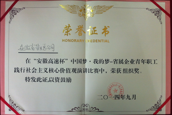 9月26日下午,由安徽省關(guān)心下一代工作委員會、安徽省國資系統(tǒng)關(guān)心下一代工作委員會主辦的“安徽高速杯”中國夢·我的夢——省屬企業(yè)青年職工踐行社會主義核心價值觀演講比賽決賽,在安徽省高速集團(tuán)隆重舉行。省公司在此次比賽中榮獲集體組織獎,代表省公司參加比賽的廬江縣公司職工柯君憑借雄厚的實力和精彩的發(fā)揮榮獲個人一等獎。