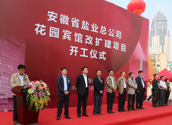 2014年10月18日上午,安徽省花園賓館改擴(kuò)建項(xiàng)目在花園賓館舉行隆重的開工奠基儀式,參加儀式的嘉賓有:中共廬陽區(qū)委書記吳勁、副書記張家祥,廬陽區(qū)副區(qū)長(zhǎng)李仲生、中建八局四公司董事長(zhǎng)周可璋及相關(guān)協(xié)作單位、省鹽業(yè)總公司總經(jīng)理詹先豪,副總經(jīng)理王良貴、顏?zhàn)谌A、楊曉彬,省公司本部機(jī)關(guān)處室及直屬公司主要負(fù)責(zé)人。